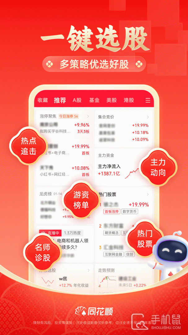 一瞬花期一瞬红,同花顺子开门红!同花顺为用户提供全面的金融投资服务,无论你是职业投资者还是普通股民,这款app都能满足你的需求,它拥有实时行情分析、资讯推送、财务数据查询等多项功能,通过同花顺,你可以及时了解各种市场走势和投资信息,快速参与股票、基金、期货等多个金融市场,同花顺还具备股票模拟交易、自选股管理、投资组合分析等工具,帮助用户更好地规划投资策略,它还支持社交分享功能,让你随时与其他投资者交流心得和经验。