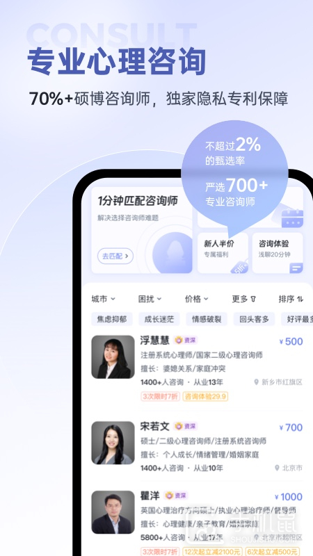 壹心理app是专为用户提供心理咨询和辅导的,无论您是面临压力、焦虑、抑郁或其他情绪问题,壹心理都能给予您专业的帮助和支持,通过与资深的心理咨询师进行线上交流,舒服地倾诉内心的痛苦和困扰,并得到个性化的解决方案,壹心理app还提供各类心理测试和评估,以帮助用户更好地了解自己的心理状态并找到合适的解决方法,壹心理还定期发布精选的心理文章和讲座,为用户提供心灵成长的启示和指导。