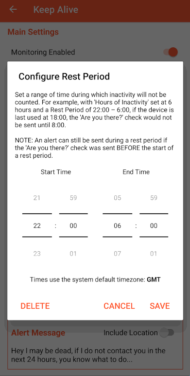 -休息时间范围 -不计算不活动时间的时间范围。例如,如果“不活动时间”设置为 6小时,休息时间为 22:00 – 6:00,如果最后一次使用设备是在 18:00,则“在吗?”支票要到 8:00才会寄出。请注意,如果“你在吗?”,在休息期间仍然可以发送警报。支票是在休息时间开始之前发送的。
