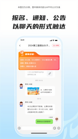双页签设计:“对话”聚焦私聊/群聊,“赛讯”聚合赛事公告,信息分类更清晰。