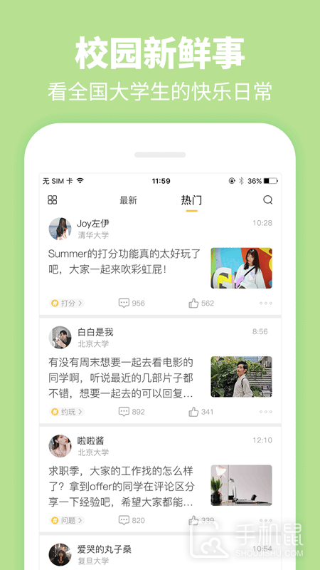 4、进入社区页面的热门中可以点击查看众多的校园新鲜事,还能打分、评论、点赞、分享等