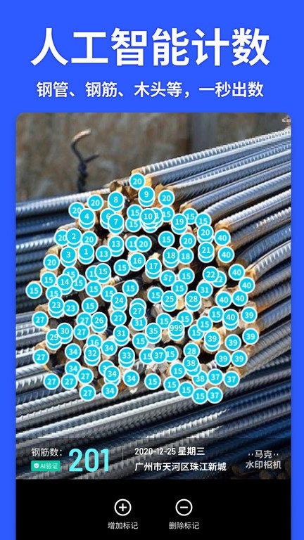 1、人工智能计数,钢筋、钢管、木头等材料均可识别,对着对应的目标计数物体拍照即可一秒出数。大幅提升工作效率!