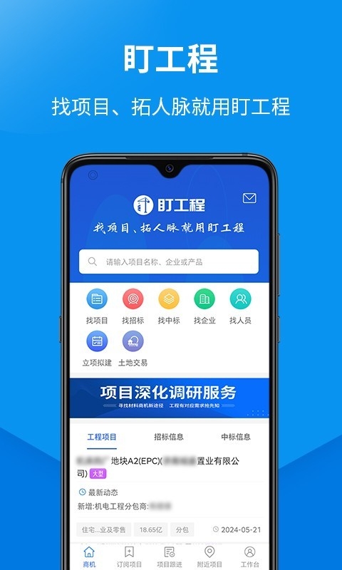 找项目、拓人脉 就用盯工程!盯工程,建筑业商机服务平台,协助企业人员抢项目商机、梳理人脉攻关路径、轻量化管理项目和人员,提高项目转化率的一站式服务解决方案。