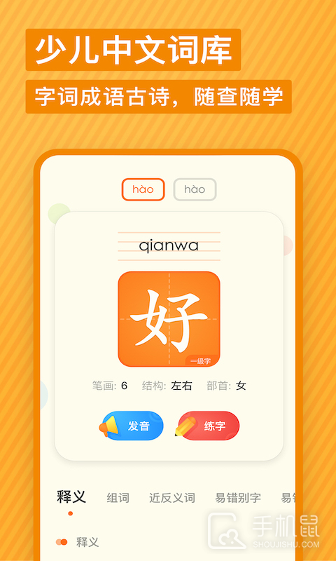 有道少儿词典app专为中小学生而设计,这款词典不仅仅提供了丰富多样的词汇解释,还包含了例句、发音和图片等功能,让孩子们更加易于理解和记忆单词,除了常规的英文词汇外,有道少儿词典app还包含了中文成语和古诗词等内容,帮助孩子们拓展语言的广度和深度,这款词典还有专属的字典游戏和九宫格练字功能,既能增加互动乐趣,又能提高孩子们的写字能力。