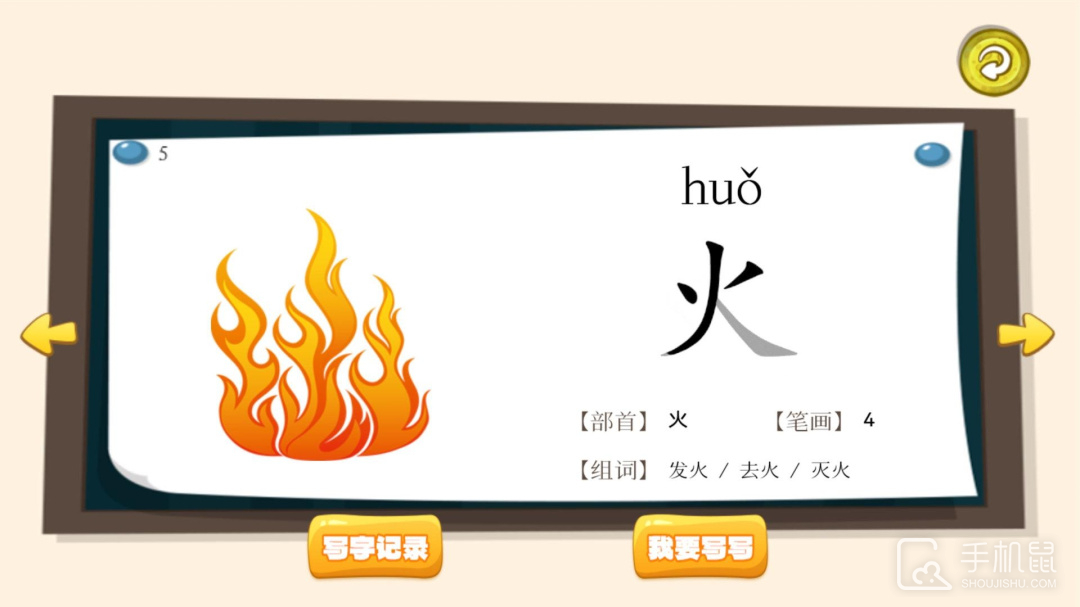 写汉字:精选了笔画较少的常用汉字,并带有图像声音以及笔画顺序;帮助孩子快速学会日常生活中简单汉字。