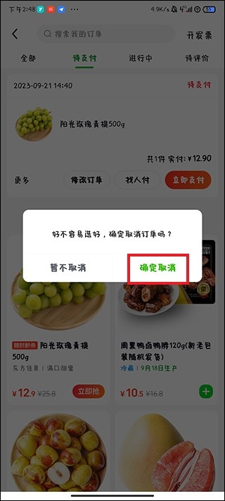 3、进入到待支付页面,该页面会显示出你的未支付订单信息,找到需要取消的订单,点击它左侧的“更多”按钮,在弹出的对话框中点击“取消订单”按钮。