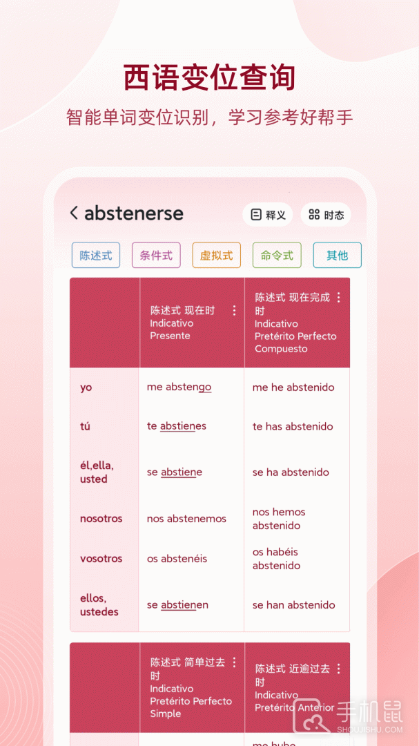 -西语动词变位查询,提供17种时态的动词变位反查功能;