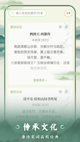 【诗词文库】五千年中华诗词文化,可以按朝代、作者、作品分类搜索,涵盖诗人、背景、注释、译文、赏析等。