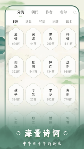 【诗词分类】对中华诗词进行分类,包括:选集、主题、课本、写景、词牌、小学、初中、高中等。