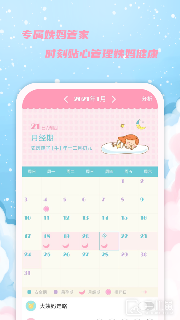 女生日历是一款专为女性用户打造的手机应用,它提供了多项实用功能,如记录月经周期、排卵期和安全期等重要信息,帮助女性掌握身体健康状况,并提供准确的预测和提醒功能,方便管理生理周期。