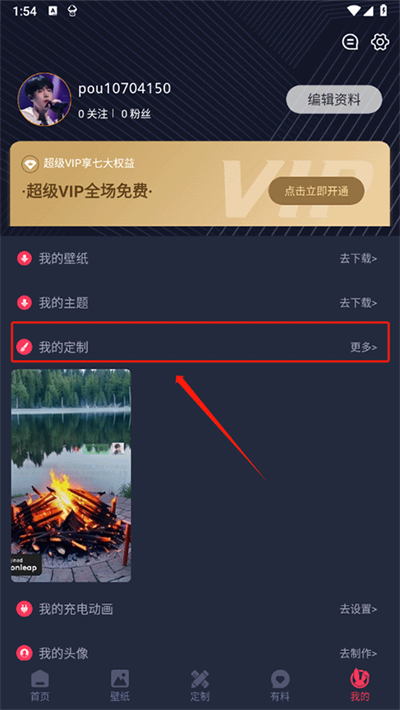 1.在我的板块内,点击我的定制选项。