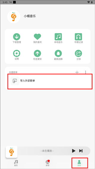 4、选择“我的”页面,点击“导入外部歌单”