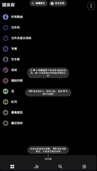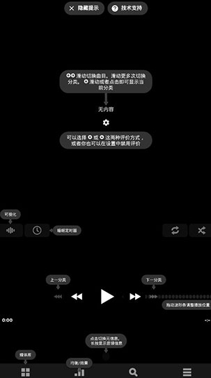 1.在软件的主界面,你可以在这里完成滑动切换曲目、滑动更多次切换分类等操作,你还可以通过滑动或者点击来显示当前分类。