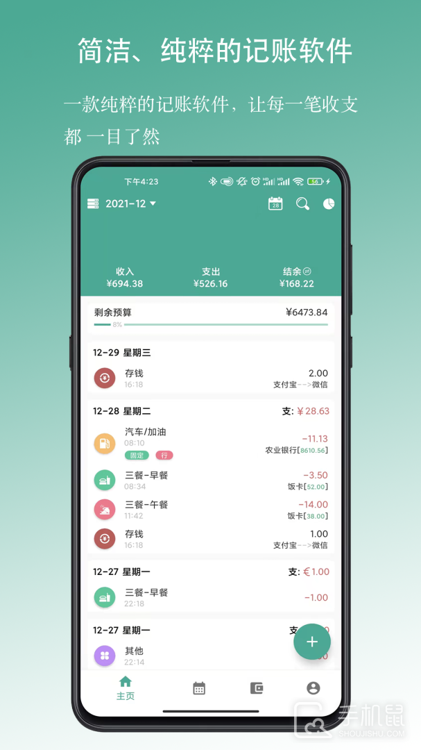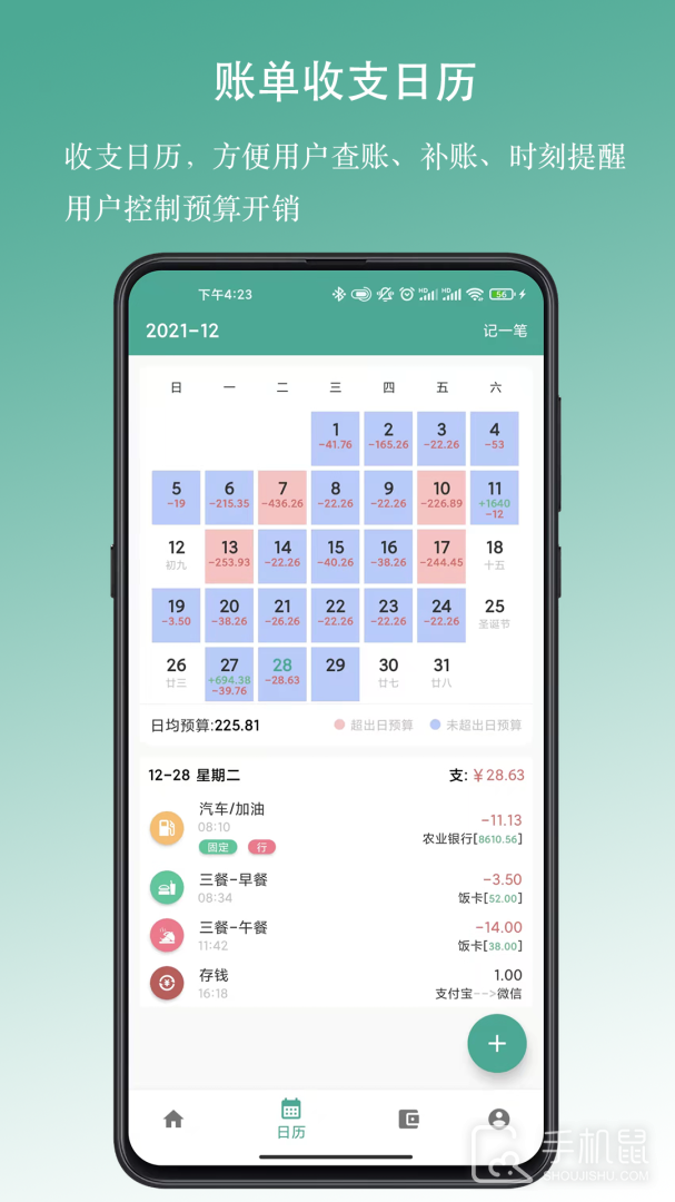 支出、收入按分类可视化统计,支持按日查看,设置预算,更合理地控制消费。