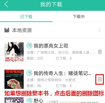3、这时,在“已下载”选项卡中,就可以看到所有已经下载到手机中的懒人听书大字版的书籍了。如果想删除某本书,只需要点击其后的删除图标即可。