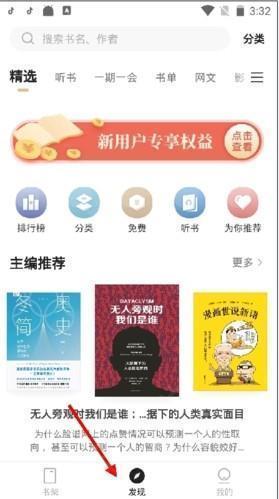 1、打开掌阅精选,点击下方的“发现”选项,在平台内寻找要下载的电子书
