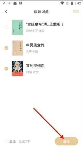 3、勾选要删除电子书阅读记录,选择完毕后,点击右下方的“删除”,即可成功将阅读记录删除
