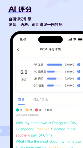 5、AI评分,自研评分引擎,发音,语法,词汇错误一网打尽;