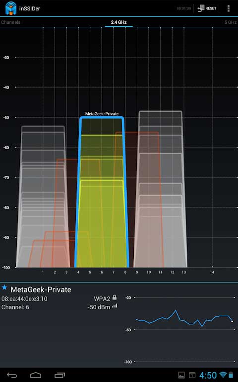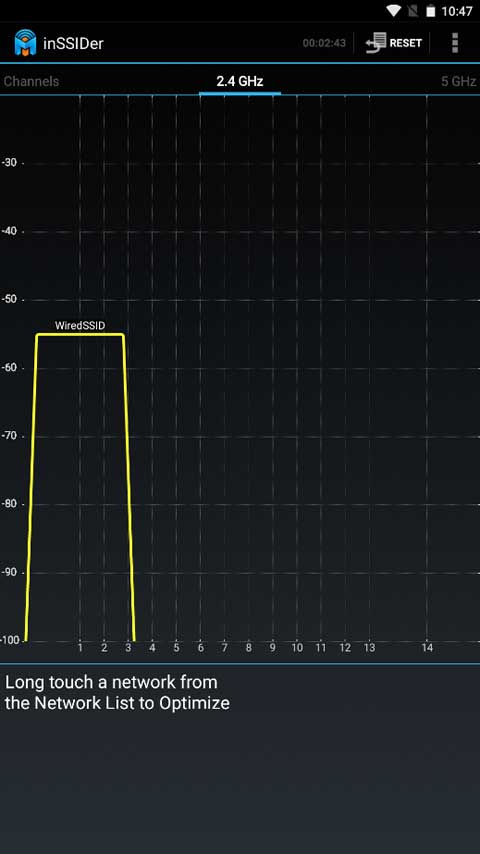 查看2.4GHz频段的信道使用状况,这是inSSIDer颇具亮点的一项功能(纵坐标表示信号强度,横坐标代表14个信道)。在此,我们不但能知晓每个无线热点占用的无线信道,还能了解该热点的信号强度。此刻,信号强度高且占用信道不拥堵的无线热点便是你的理想之选。