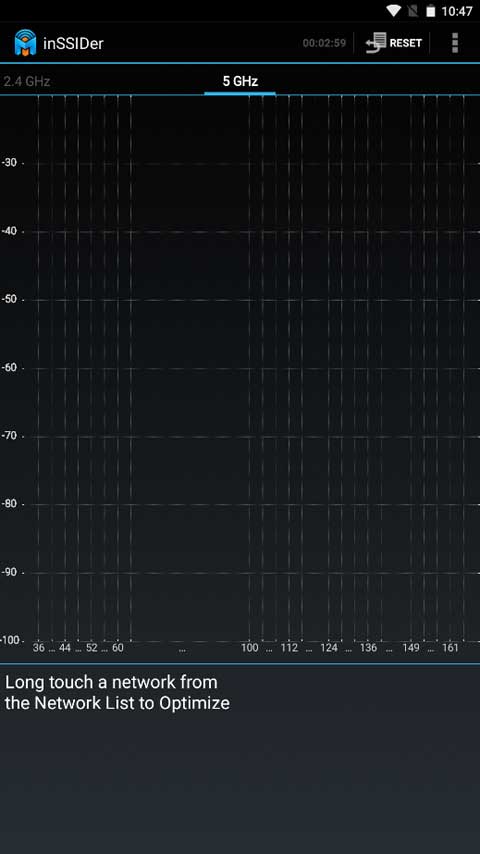 inSSIDer为广大用户提前准备了一项颇为前卫的功能,即查看5GHz频段信道使用情况,其显示效果与2.4GHz频段一致。可以预见,在双频段无线网络全面普及之时,inSSIDer依旧会为你提供这样的选择。