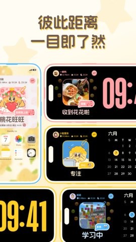 Standby Us软件中有超多可爱精美的小组件,包括时钟、便签、日历等,还可以设置在线状态,你可以和你的朋友共享距离、起床和睡觉时间,让彼此的心越靠越近,随时随地的记录生活,记录起床时间和入睡时间,让生活元气满满,心情好好!