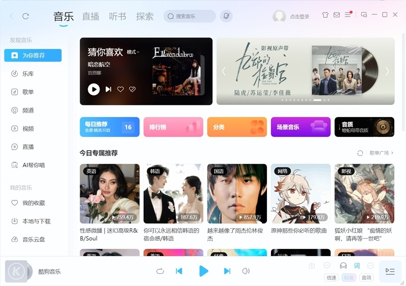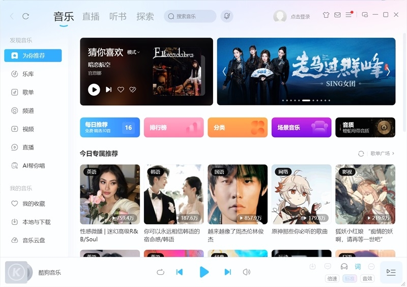 4、智能推荐功能:酷狗音乐概念版2.5.5旧版本这款软件里的智能推荐功能能够根据用户的听歌历史和偏好推荐符合用户口味的音乐。