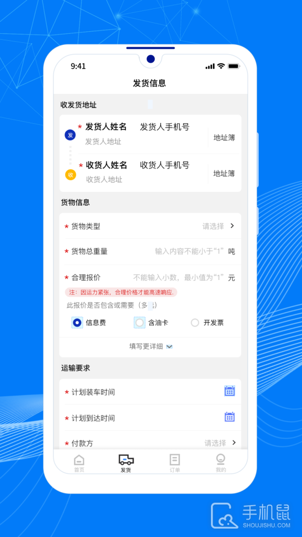 用户可以在发货主页中将需要运输的货源信息进行在线编辑发布即可