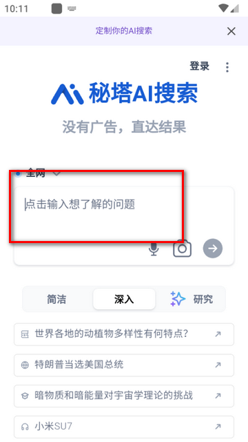 3、集成的是ai秘塔搜索,输入想了解的问题快速搜索。