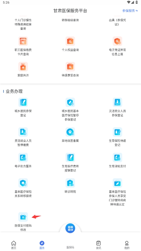 1、参保群众可通过登录甘肃医保服务平台APP,在“服务”区域内,定位至“业务办理”模块,选择【医保支付密码修改】功能进行密码修改。