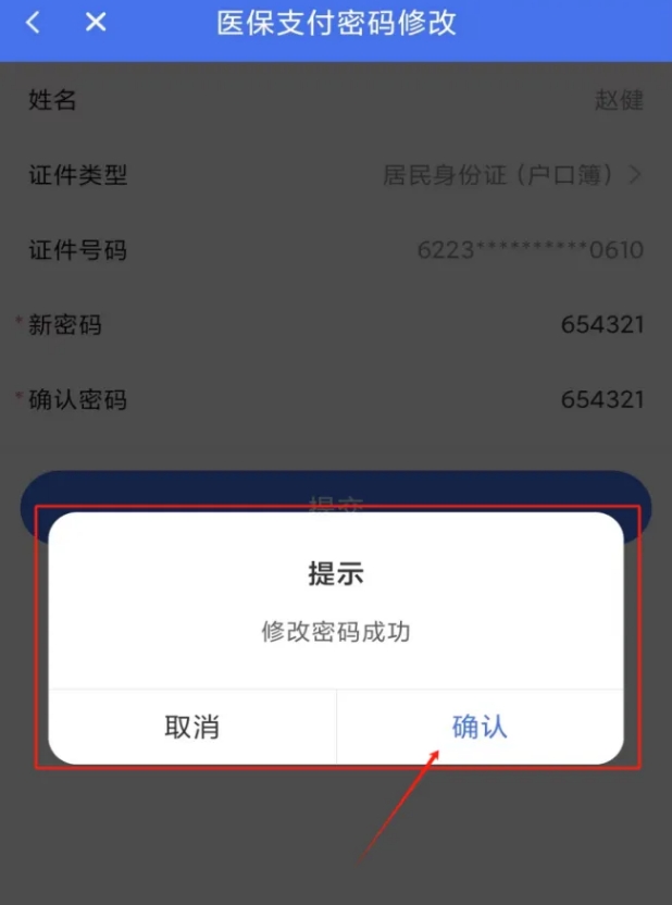 4、密码修改。人脸识别验证成功后,系统将自动完成医保支付密码的修改,并弹出“修改密码成功”提示。密码修改完成后,参保人可凭新密码在定点医药机构进行医保刷卡结算。