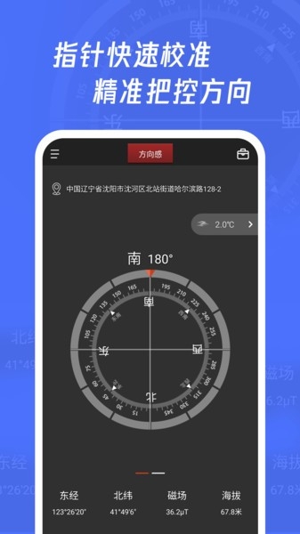 【户外指南针】支持海拔、气压、磁场强度、实况天气等专业户外指南针功能;