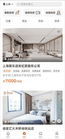 1、下载登录城家公寓app,进入首页,可以看到有整租公寓、多人宿舍、城市短租,你可以通过通勤找房、地图找房、视频找房、专人找房进行快速找房;