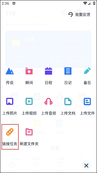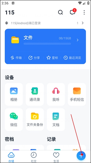 1、打开115软件,进入用户存储首页,点击屏幕右下角的“加号”按钮;