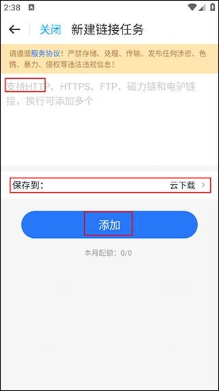 4、来到新建链接任务页面,在输入框中输入链接下载地址,再点击“保存到”按钮,选择保存目录,最后点击“添加”按钮即可。