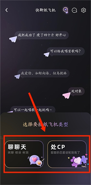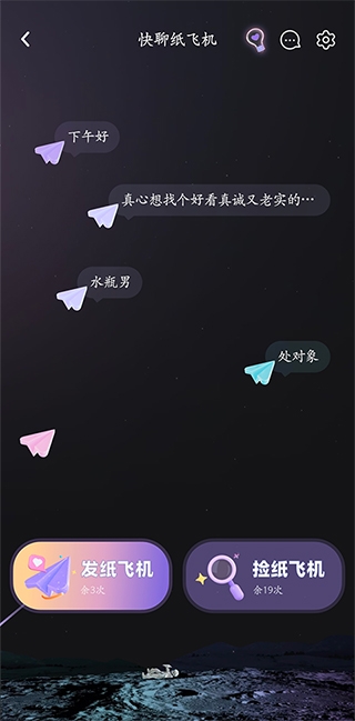 2、进入后可选择纸飞机或者捡纸飞机(发可以让别人找你,捡可以直接与相似好友速配),点击【捡纸飞机】打开。