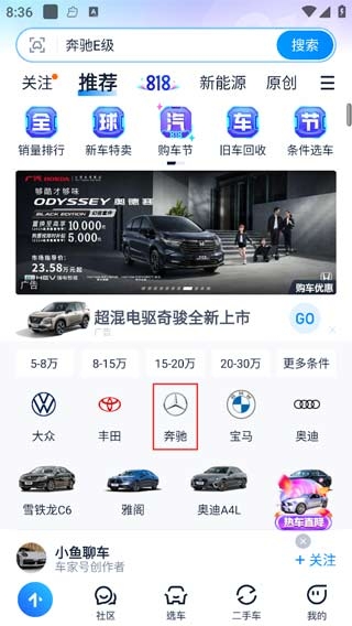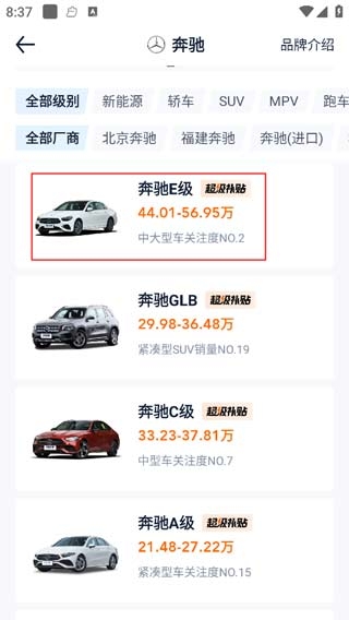 2、进入车型品牌页面,可以看到旗下的多款车型,选中想要对比的车点击打开,如奔驰;
