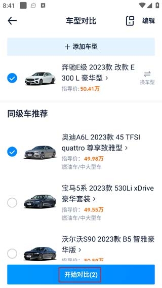 5、接着来到对比车型的选择页面,同车型的话可以直接选择不同版本对比,如果不同品牌不同车型对比的话,需要按品牌查找,然后选择相应的车型;