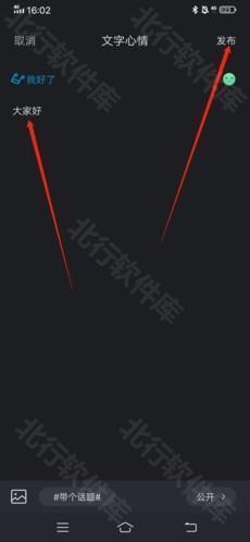 2、在编辑页面中输入想要发布的文字心情,确认无误后,点击右上角“发布”,这样就成功发表文字