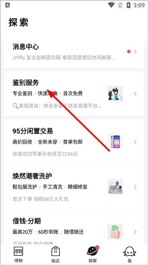 1、登录毒app,进入探索页面,可查看消息中心、鉴别服务、95分闲置交易、焕然潮奢洗护等,点击鉴别服务;