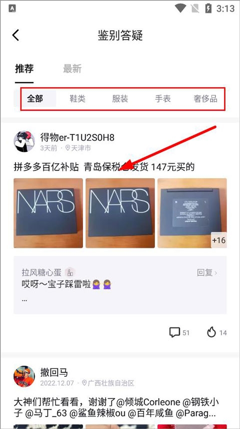 3、鉴别答疑页面可以看到潮友分享的鞋类、服装、手表、奢侈品的鉴别答疑,判断产品真假。