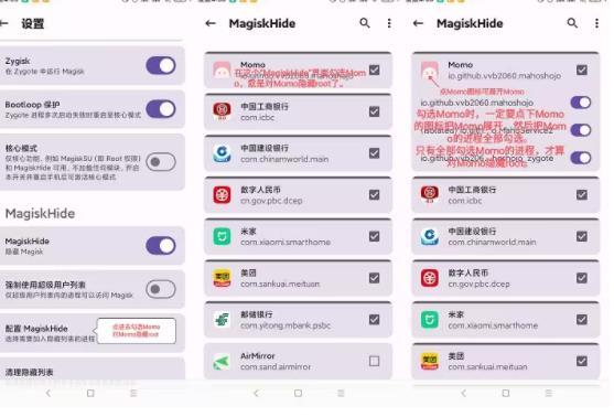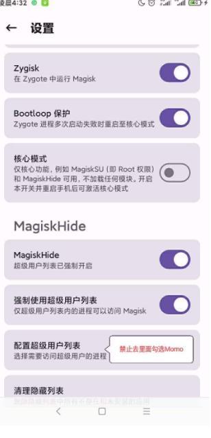 如果未开启“强制使用超级用户列表”选项,那么你需要在德尔塔版面具的MagiskHide界面勾选Momo,才能对Momo隐藏root。