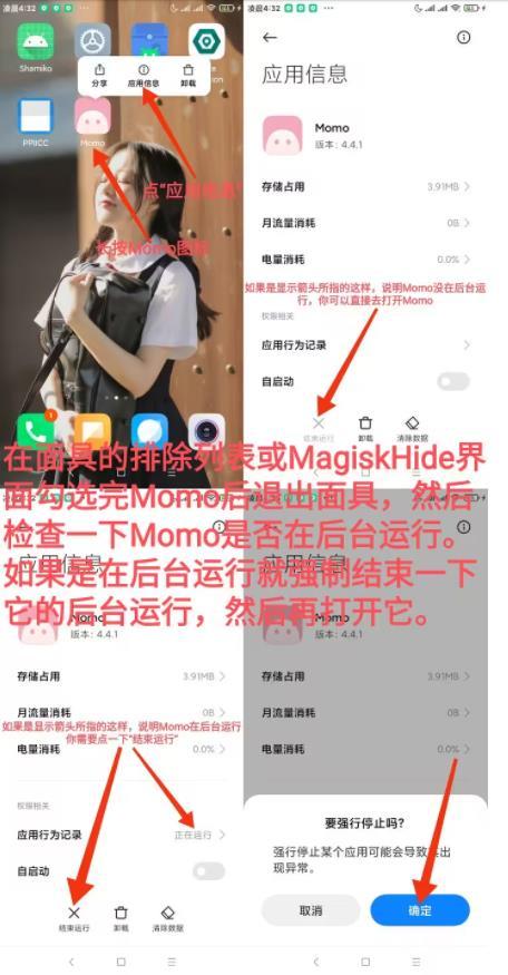 完成对momo隐藏root的操作后,先检查一下momo是否在后台运行。如果在后台运行,就强制结束一下它的后台运行再打开它。此举是为了避免隐藏root不及时生效时,momo检查结果存在假异常情况