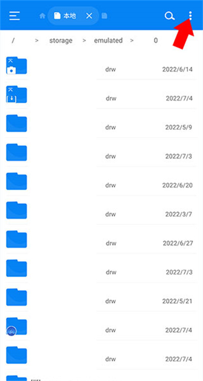 2.我们点击后来到下方界面,可以看到我们手机中所有的文件夹这里对文件夹名称进行了涂抹,如果需要对其进行存储空间分析可以点击右上角的三个竖排点号按钮。