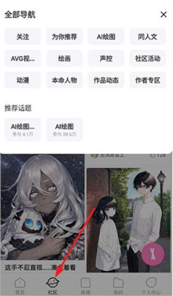 4.切换到社区,这里有众多你感兴趣的话题,例如ai绘图、声控、绘画、动漫等。
