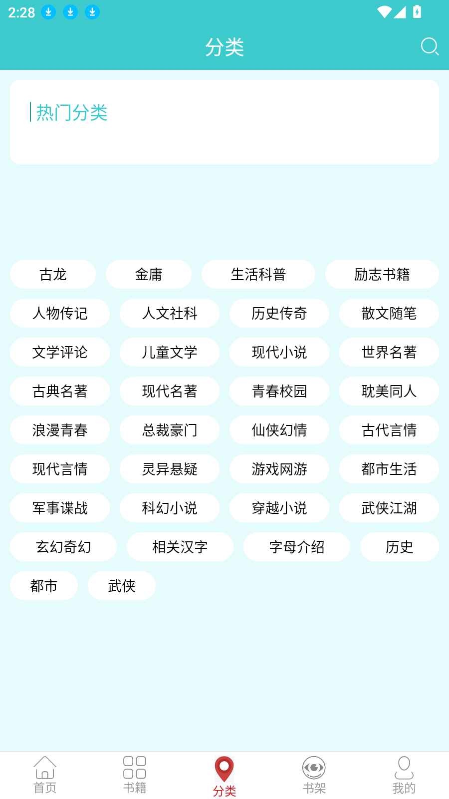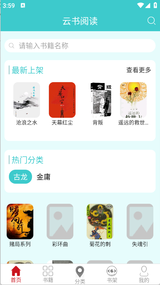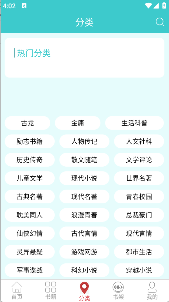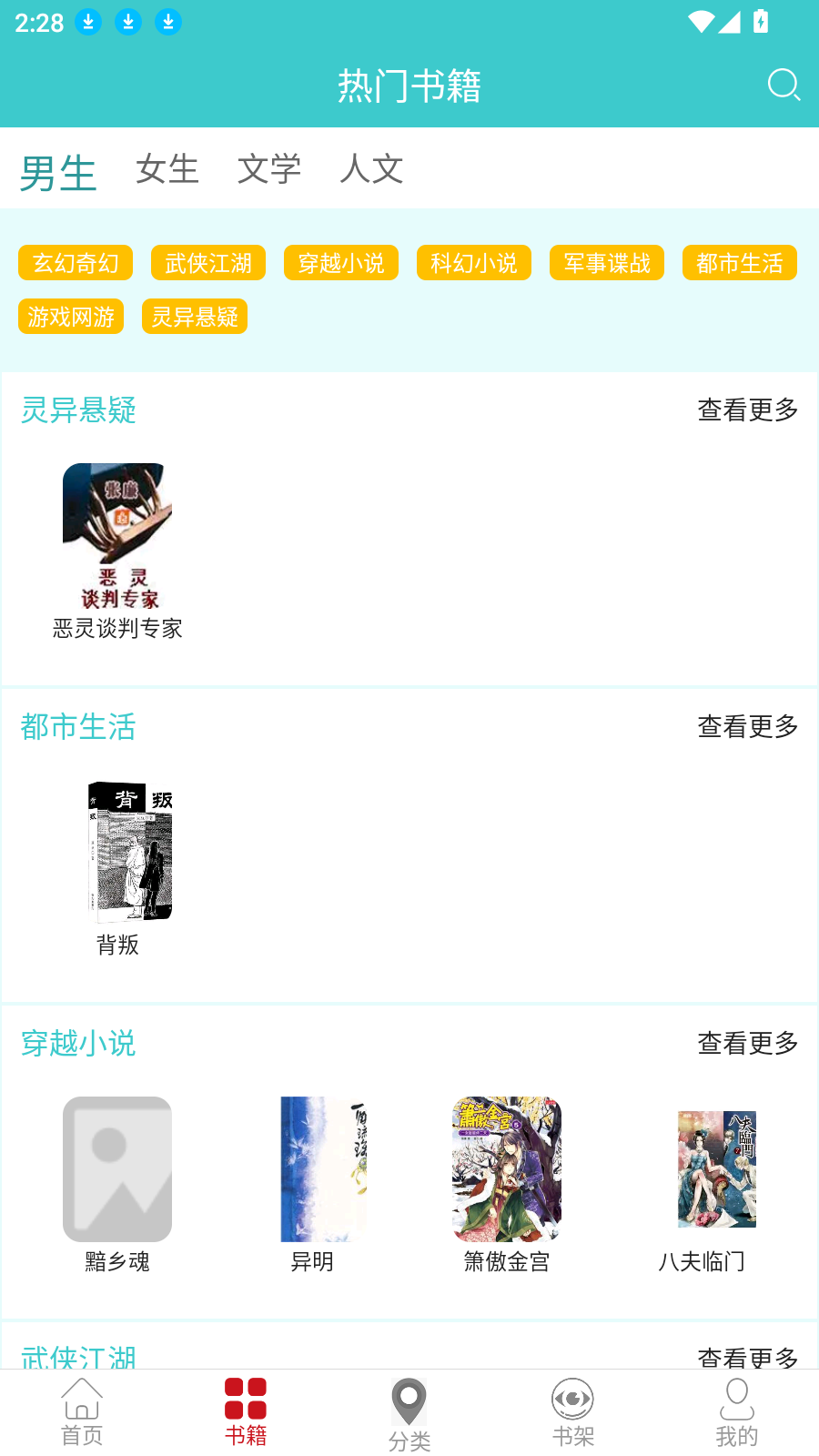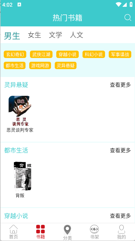 3、“书籍”和“分类”页面,将小说进行了详细的归类,不管是文学、人文还是仙侠等类型都有。