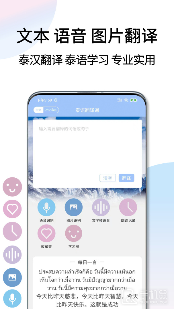 在应用首页即可一键完成泰语文本翻译、语音识别翻译、图片识别等,翻译方式能够灵活选择,还能够支持双语文本转语音。