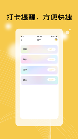 3.支持打卡提醒,用户可以在这里设定早起、跑步、游泳、喝水等事项的提醒,合理的安排工作和生活上的事,让一切有序的进行;