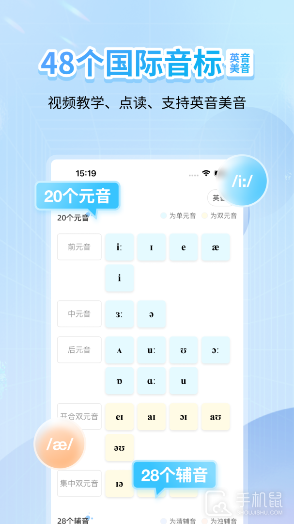 该app提供英语音标的学习功能,包括准确发音、音标符号解析、单词发音示范等,对于学习英语发音的用户来说十分实用,可帮助提高听力和口语表达能力。
