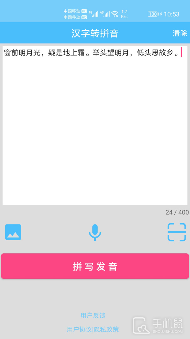 《汉字拼音转换》是一款方便实用的安卓应用程序,旨在帮助用户快速将汉字转化为对应的拼音,无论您是在学习中文、准备考试还是需要快速查词,都是您的必备工具,只需输入汉字,即可迅速获得该汉字的标准拼音,并附带详细的读音示例,美观简洁的界面设计使操作更加直观和便捷,不论您是初学者还是专业人士,都能轻松上手,应用还有常见的中文字典功能,方便用户查询更多生词和释义。