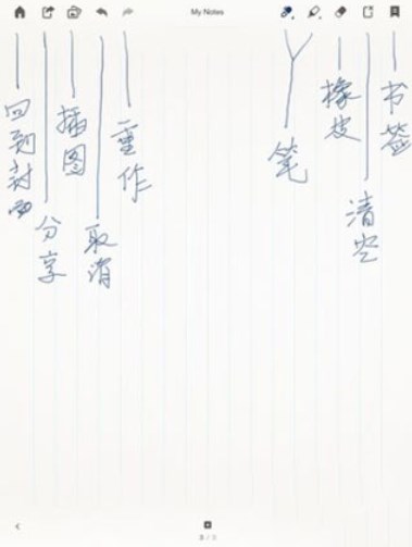 1、双击笔记可以新建一个空白页,对应上图的注释,上方功能列表从左至右分别为:返回封面、分享、上一步与下一步、画笔、马克笔、橡皮擦、清除整页以及设置标签。
